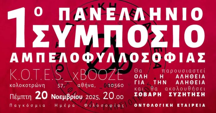 Με αφορμή την Παγκόσμια Ημέρα Φιλοσοφίας 2025, οι Κ.Ο.Τ.Ε.Σ. (ex BOOZE Cooperativa) και η Οντολογική Εταιρεία, σας προσκαλούν στο Πρώτο Πανελλήνιο Συμπόσιο Αμπελοφυλλοσοφίας και στην παρουσίαση του βιβλίου «Όλη η Αλήθεια για την Αλήθεια (εγχειρίδιον Αμπελοφυλλοσοφίας)» της Οντολογικής Εταιρείας, την Πέμπτη 20 Νοεμβρίου 2025, στις 20:00, στο Κ.Ο.Τ.Ε.Σ. (ex BOOZE Cooperativa).