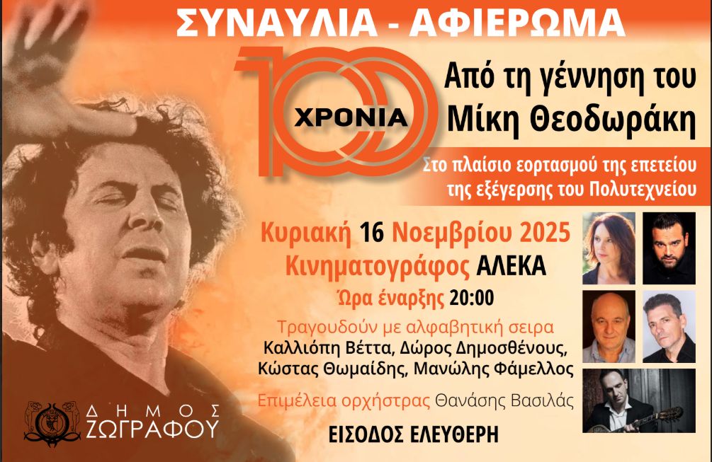 Ο Δήμος Ζωγράφου, με αφορμή την επέτειο της Εξέγερσης του Πολυτεχνείου, διοργανώνει μια ξεχωριστή συναυλία-αφιέρωμα με τίτλο: «100 χρόνια από τη γέννηση του Μίκη Θεοδωράκη», τιμώντας τον μεγάλο Έλληνα δημιουργό που σφράγισε με το έργο και τη στάση ζωής του τη νεότερη ελληνική ιστορία.