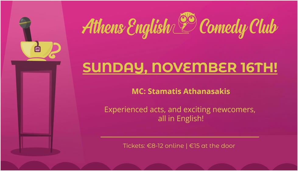 Το Athens English Comedy Club ιδρύθηκε το 2019 και είναι το πρώτο, και μοναδικό, εξ’ολοκλήρου Αγγλόφωνο comedy club στην Ελλάδα!