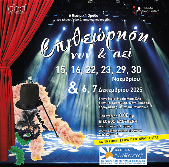 “Επιθεώρηση Νυν & Αεί” είναι η νέα παράσταση της Θεατρικής Ομάδας του Δήμου Αγίου Δημητρίου σε σκηνοθεσία της Μαρίας Μπακέλλα, σκηνικά – κοστούμια της Τζένης Σιαράβα και χορογραφίες της Βικτωρίας Θανασούλα, που θα παρουσιαστεί στο Δημοτικό Θέατρο Μελίνα Μερκούρη (στο Δημαρχείο) στις 15 & 16, 22 & 23, 29 & 30 Νοεμβρίου 2025, στις 20:00.