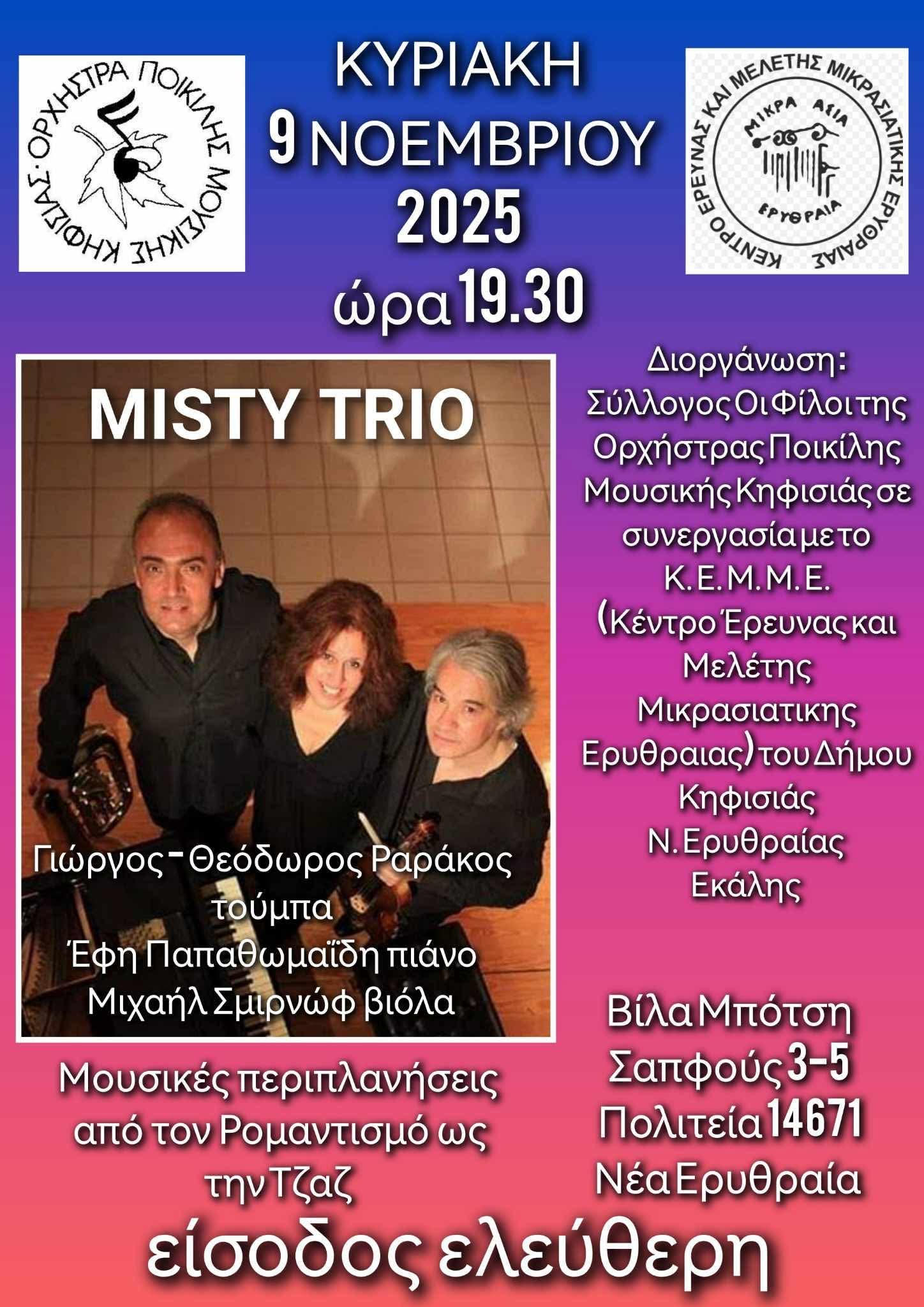 Ο Σύλλογος «Οι Φίλοι της Ορχήστρας Ποικίλης Μουσικής Κηφισιάς», σε συνεργασία με το Κέντρο Έρευνας και Μελέτης της Μικρασιατικής Ερυθραίας (Κ.Ε.Μ.Μ.Ε) του Δήμου Κηφισιάς, Νέας Ερυθραίας και Εκάλης σας προσκαλούν την Κυριακή 9 Νοεμβρίου, ώρα 7:30 μ.μ. στη Βίλα Μπότση (Σαπφούς 3-5, Πολιτεία-Νέα Ερυθραία) στη συναυλία από τον Ρομαντισμό έως την Τζαζ με το MISTY TRIO: Έφη Παπαθωμαΐδη (πιάνο), Γιώργος Ραράκος (τούμπα) και Mikhail Smirnov (βιόλα).