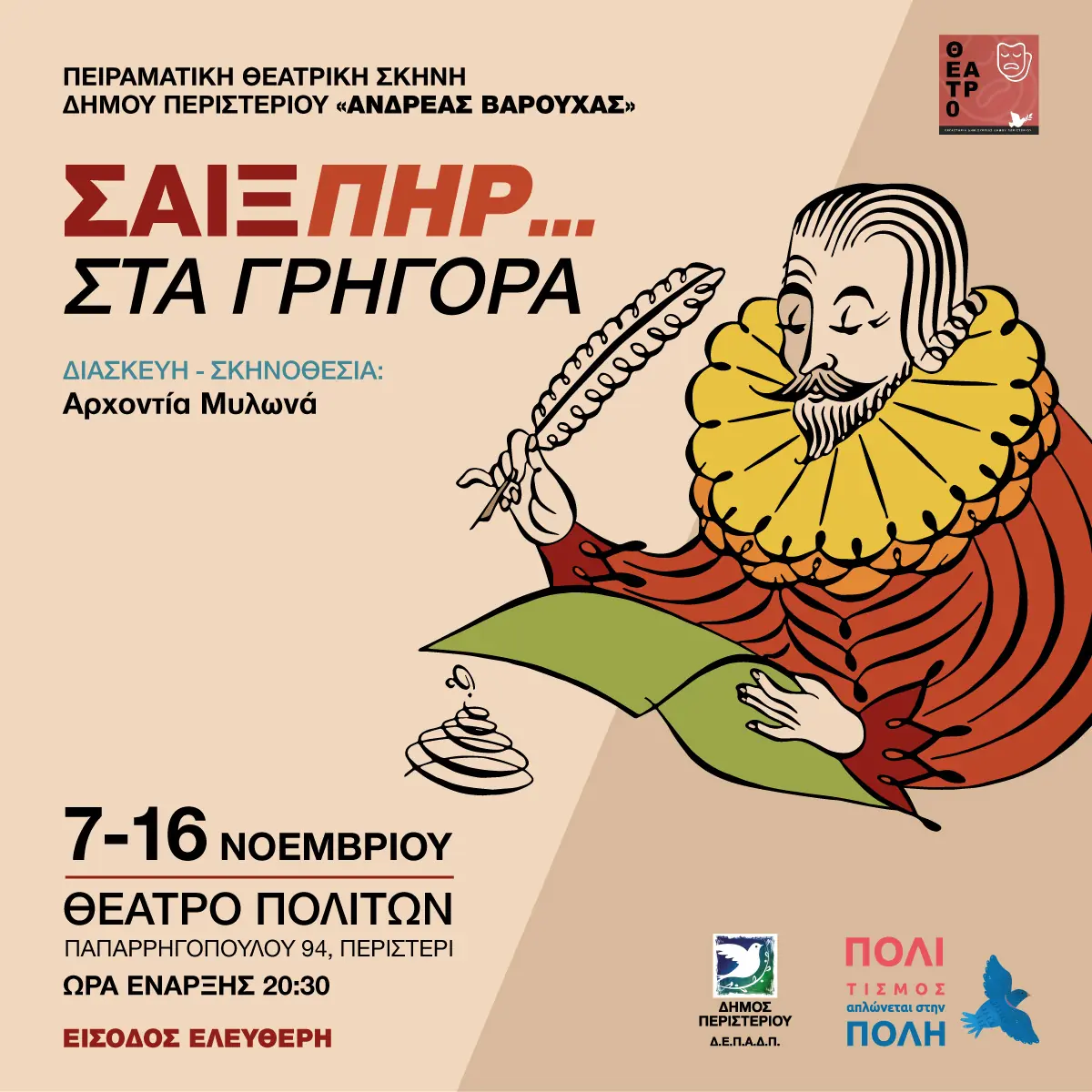 Ο Δήμαρχος Περιστερίου Ανδρέας Π. Παχατουρίδης σας προσκαλεί στη νέα θεατρική παράσταση της Πειραματικής Θεατρικής Σκηνής “Ανδρέας Βαρούχας” του Δήμου Περιστερίου, με τίτλο «ΣΑΙΞΠΗΡ… ΣΤΑ ΓΡΗΓΟΡΑ», σε διασκευή και σκηνοθεσία της Αρχοντίας Μυλωνά. Η παράσταση παρουσιάζεται στο Θέατρο Πολιτών (Παπαρρηγοπούλου 94, Περιστέρι), από 7 έως 16 Νοεμβρίου 2025, ώρα έναρξης 20:30, με ελεύθερη είσοδο για το κοινό.