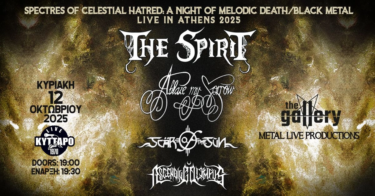 Το THE GALLERY Metal Live Productions σας προσκαλεί σε μια εκρηκτική βραδιά μελωδικού Death/Black Metal, γεμάτη ένταση, πάθος και δυνατές συγκινήσεις! Δύο σπουδαία συγκροτήματα από το εξωτερικό, οι Γερμανοί THE SPIRIT και οι Σουηδοί ABLAZE MY SORROW, ενώνουν τις δυνάμεις τους και έρχονται για πρώτη φορά στην Ελλάδα, για να ταράξουν τα νερά της εγχώριας Μέταλ σκηνής! Πλαισιωμένοι από τους δικούς μας, δυναμικούς SCAR OF THE SUN και τους ανερχόμενους ASCENDING OLYMPUS, ετοιμαστείτε για μια νύχτα που θα μείνει χαραγμένη στη μνήμη κάθε metalhead. Το μεταλλικό κοινό της Αθήνας δεν πρέπει να λείπει από αυτή τη μοναδική εμπειρία!
