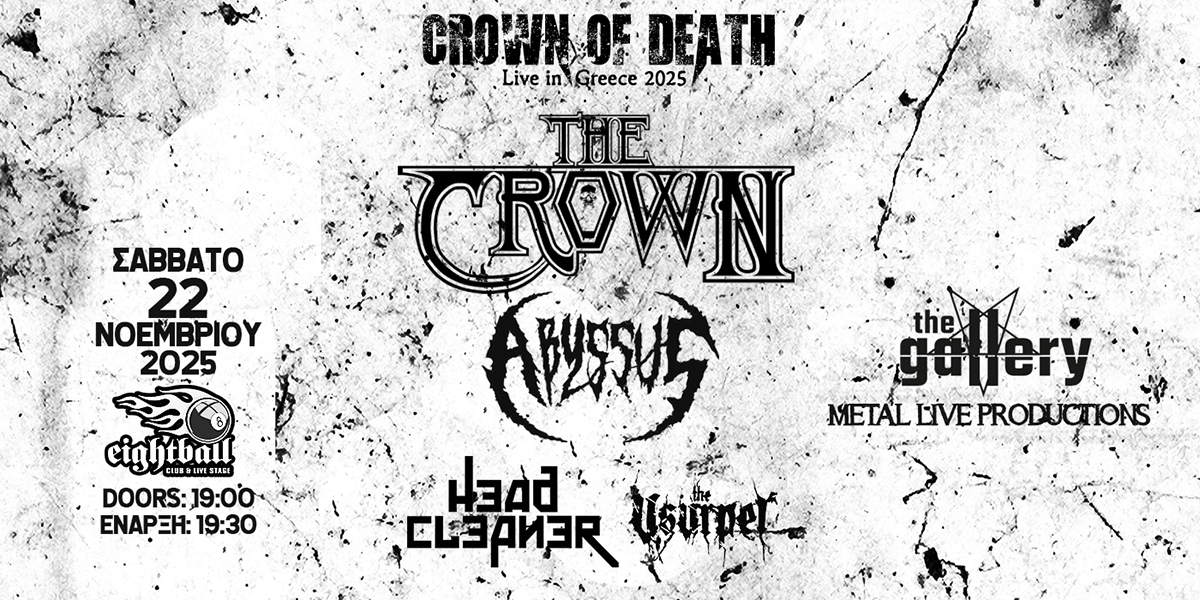 Μετά από τριάντα πέντε χρόνια αδιάκοπης πορείας και δώδεκα άλμπουμ που καθόρισαν τον ήχο του μελωδικού Death/Thrash Metal, οι THE CROWN επισκέπτονται για πρώτη φορά την Ελλάδα. Οι δύο συναυλίες τους σε Θεσσαλονίκη και Αθήνα, στο πλαίσιο των Death Metal συναυλιών «Crown of Death», αποτελούν ορόσημο για την εγχώρια Metal σκηνή, σηματοδοτώντας την πολυαναμενόμενη άφιξη μιας μπάντας που εδώ και δεκαετίες κρατά αμείωτη τη φλόγα του ακραίου ήχου.
