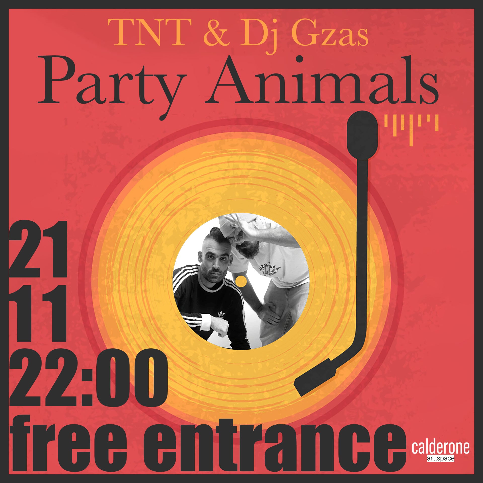 Το γνωστό πλέον δίδυμο ΤΝΤ & Dj Gzas, με το καθιερωμένο set μουσικών επιλογών “Party Animals” , στις 21 Νοέμβρη ημέρα Παρασκευή, βαράει για πρώτη φορά στο Calderone Art Space, στον Κεραμεικό/ Γκάζι . Ελάτε να τη βρούμε ή να την ψάξουμε