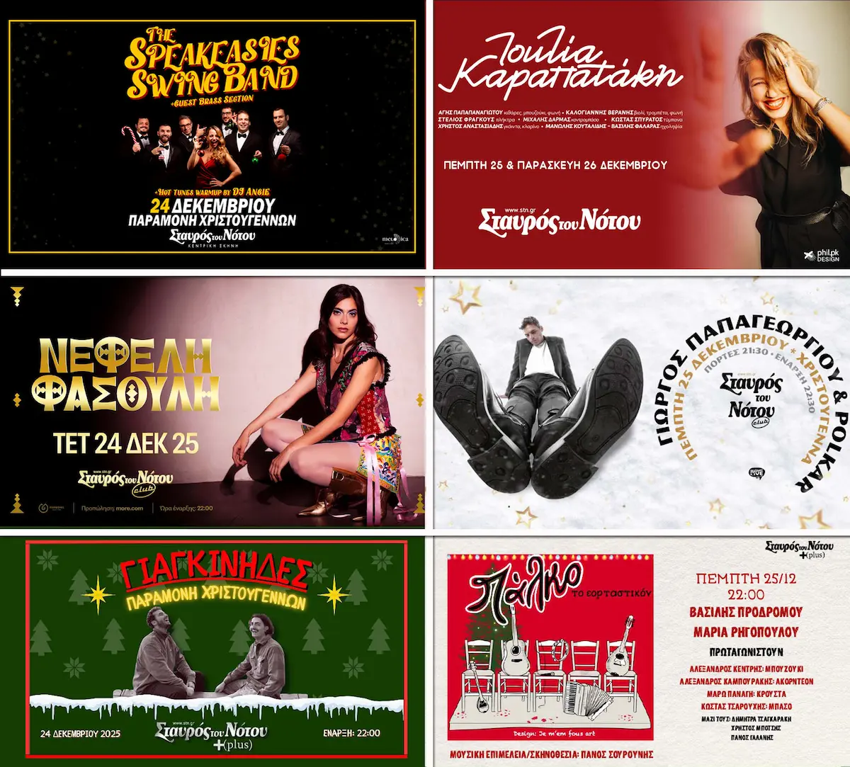 “Ψάχνετε πού να κάνετε Ρεβεγιόν Χριστουγέννων στην Αθήνα; Ο Σταυρός του Νότου (Φραντζή & Θαρύπου, Νέος Κόσμος) ετοίμασε το πιο δυνατό εορταστικό πρόγραμμα για τις 24, 25 και 26 Δεκεμβρίου 2025. Δείτε αναλυτικά ποιοι τραγουδούν σε Κεντρική Σκηνή, Club και Plus και κλείστε τραπέζι για Polkar, Γιαγκίνηδες, Speakeasies και Ιουλία Καραπατάκη.”