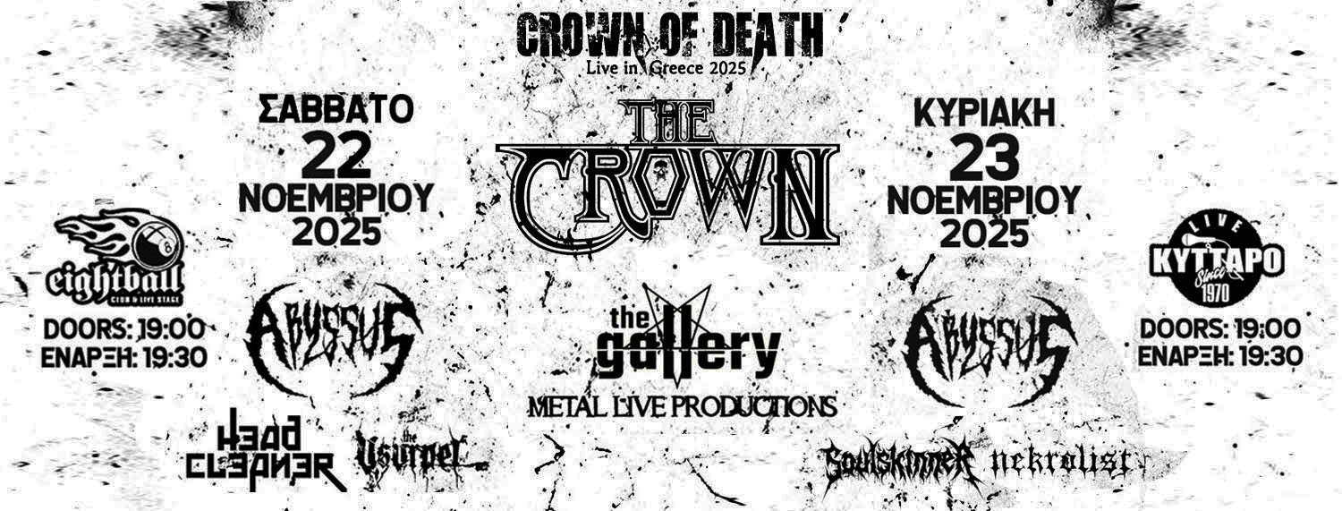 Μετά από τριάντα πέντε χρόνια αδιάκοπης πορείας και δώδεκα άλμπουμ που καθόρισαν τον ήχο του μελωδικού Death/Thrash Metal, οι THE CROWN επισκέπτονται για πρώτη φορά την Ελλάδα. Οι δύο συναυλίες τους σε Θεσσαλονίκη και Αθήνα, στο πλαίσιο των Death Metal συναυλιών «Crown of Death», αποτελούν ορόσημο για την εγχώρια Metal σκηνή, σηματοδοτώντας την πολυαναμενόμενη άφιξη μιας μπάντας που εδώ και δεκαετίες κρατά αμείωτη τη φλόγα του ακραίου ήχου.