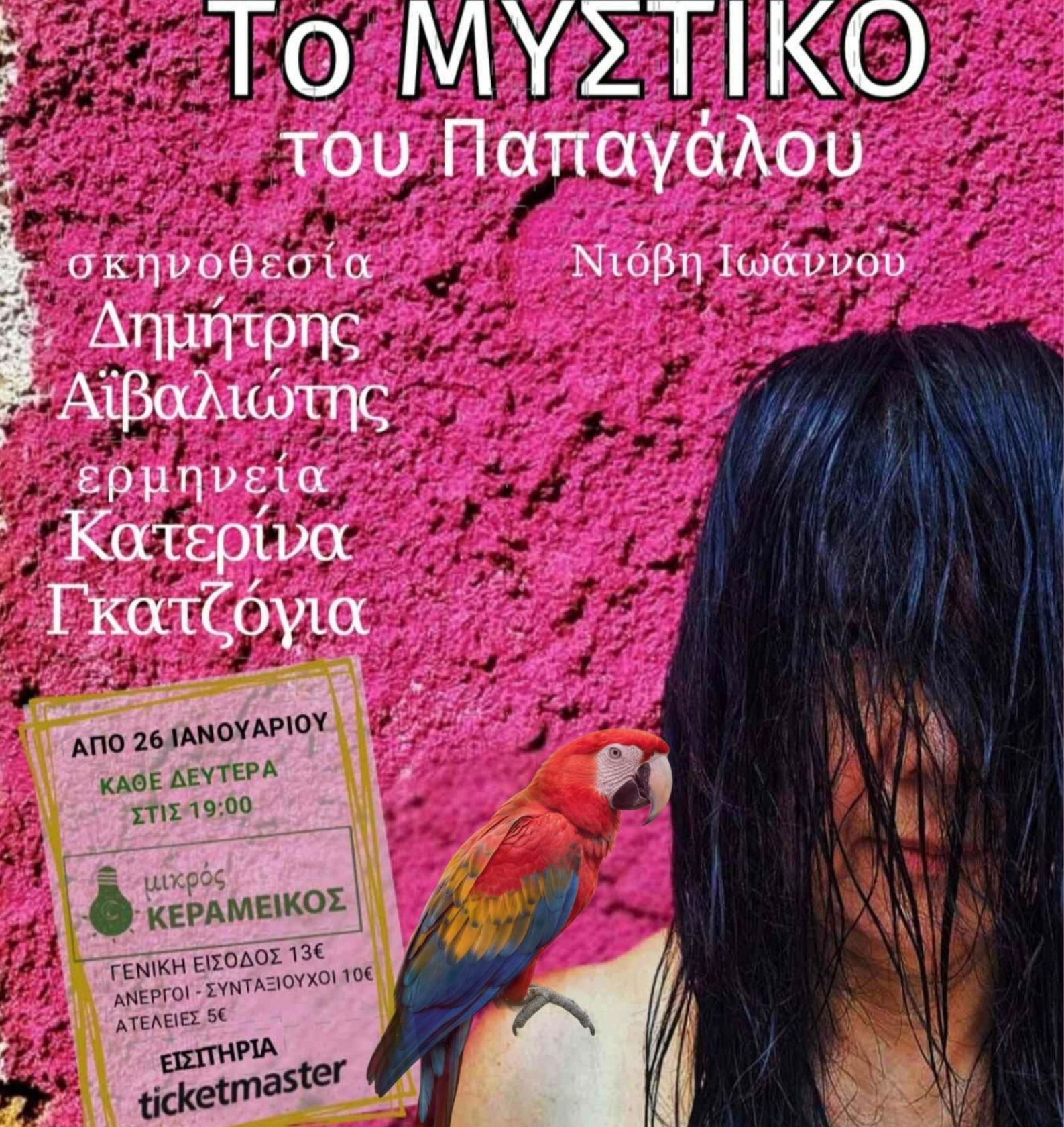 Η πρεμιέρα του θεατρικού μονολόγου «Το Μυστικό του Παπαγάλου», σε κείμενο της Νιόβης Ιωάννου και σκηνοθεσία Δημήτρη Αϊβαλιώτη, έρχεται τη Δευτέρα 26 Ιανουαρίου 2026 στη σκηνή του θεάτρου «Μικρός Κεραμεικός».