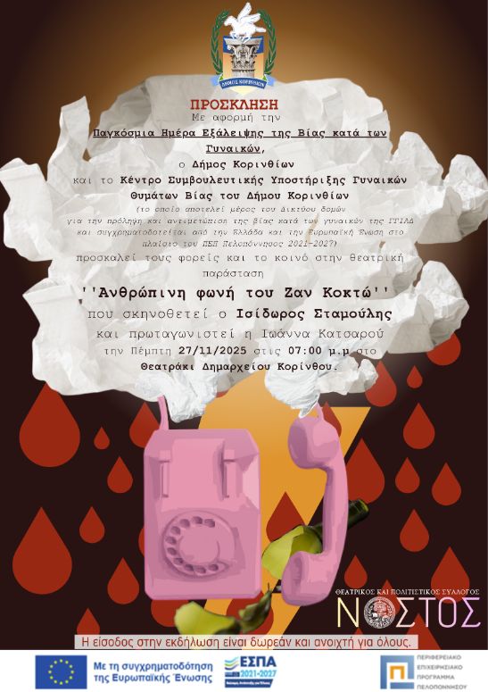 Ανθρώπινη Φωνή στην Κόρινθο Για κάθε γυναίκα που έχει βιώσει βία, ώστε να ξανασταθεί δυνατή, ελεύθερη και με αξιοπρέπεια Με αφορμή την Παγκόσμια Ημέρα για την Εξάλειψη της Βίας κατά των Γυναικών ο Δήμος Κορινθίων και το Κέντρο Συμβουλευτικής Υποστήριξης Γυναικών – Θυμάτων Βίας του Δήμου, μας προσκαλούν σε μια ξεχωριστή εκδήλωση, όπου η τέχνη […]